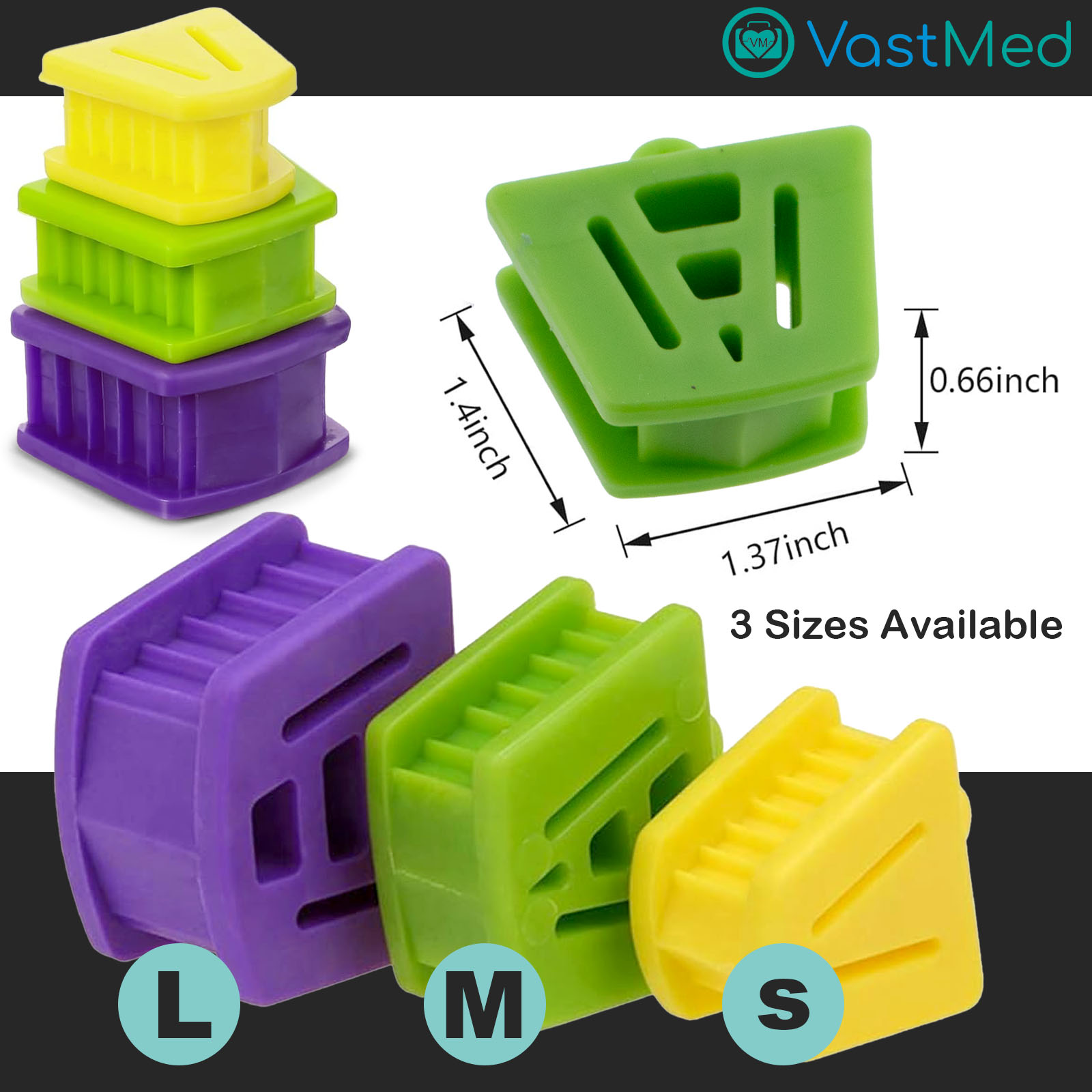 - Package Includes – Available in packs of 3 and 9 pieces, these bite blocks come in yellow, purple, and green colors with a size range from small to Large (universal fit) — designed to meet professional medical and dental standards.