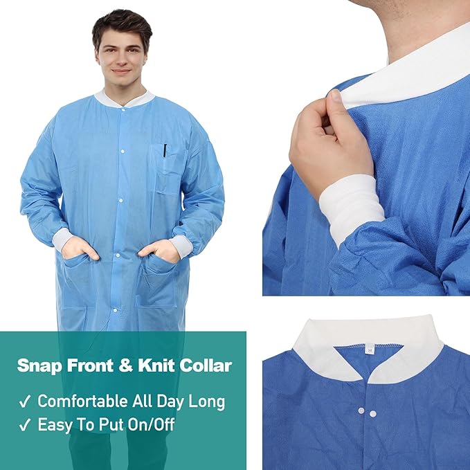 - Multiple Uses – Disposable lab jackets are ideal for a variety of industrial and medical uses and settings, including hospitals, dental offices, laboratories, clinics, pharmacies, standard isolation, and more.
