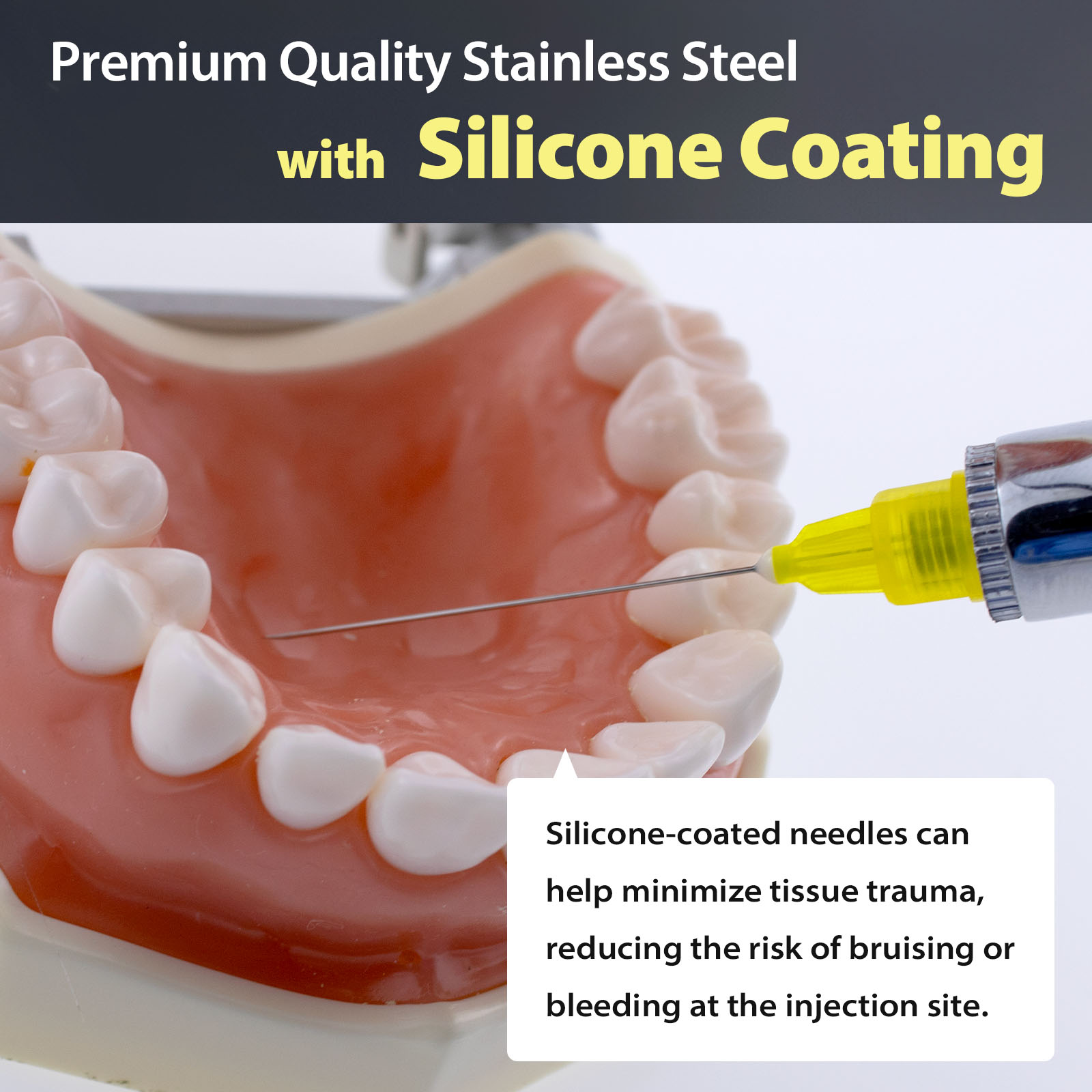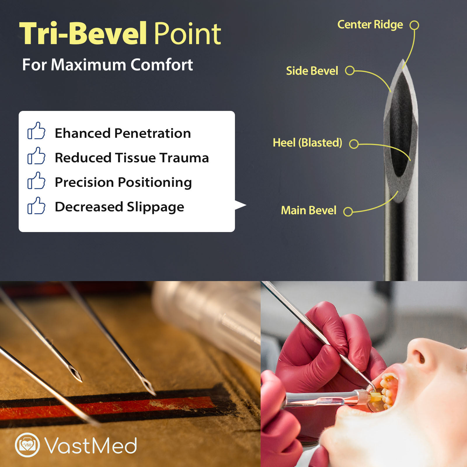 - Triple Sharpening Material – VASTMED triple sharpening needle has excellent flexibility and features an arrow indicator to help orient the bevel position during injections. The needle is siliconized to ensure a gentle insertion into tissue, resulting in minimal discomfort during dental procedures.