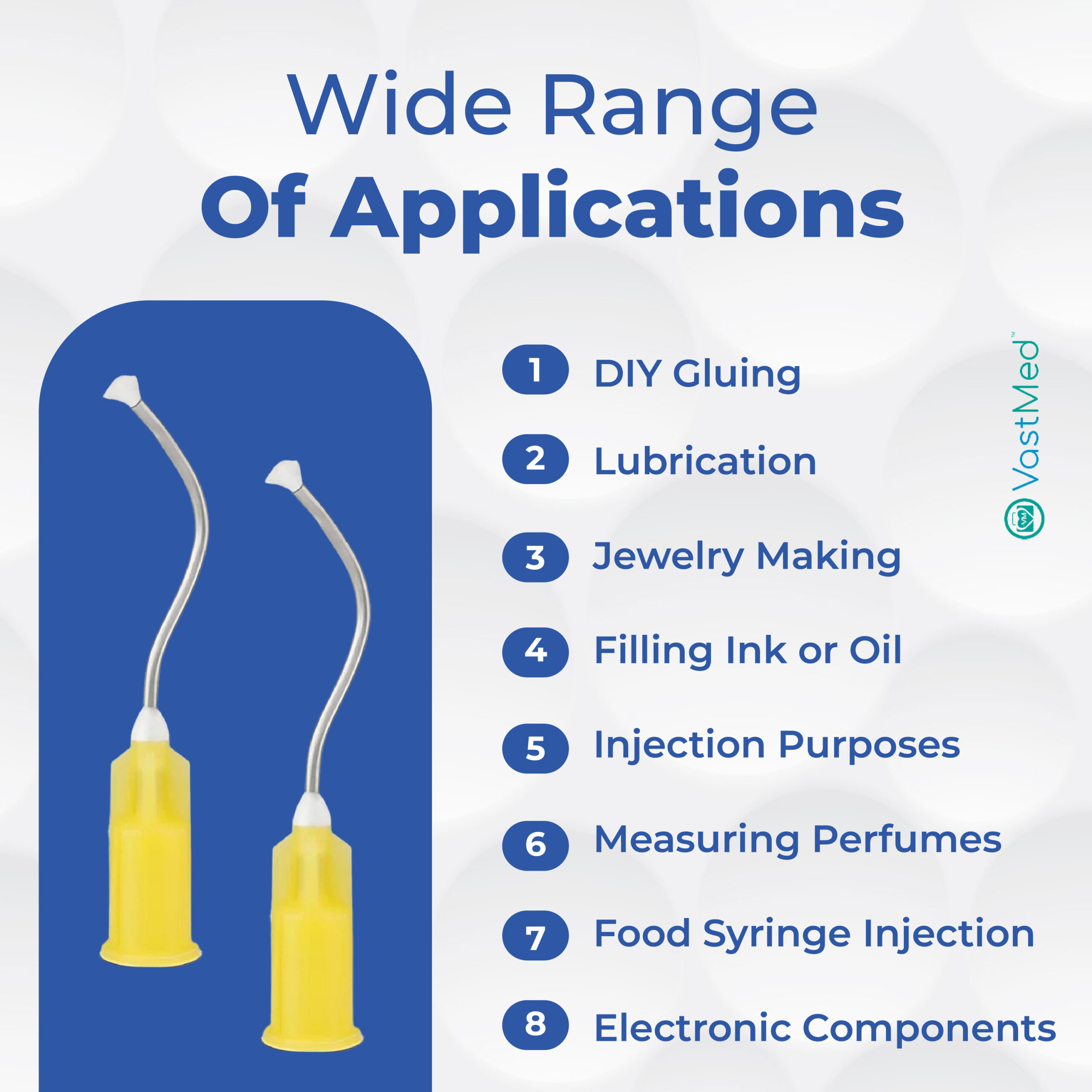 - PREMIUM QUALITY: VASTMED bent dispensing tips are made of premium quality Stainless Steel + PP, a sturdy and lightweight material that is not easily deformed or rusted. These can be attached to a syringe without touching the needle and are suitable for all standard luer lock syringes.