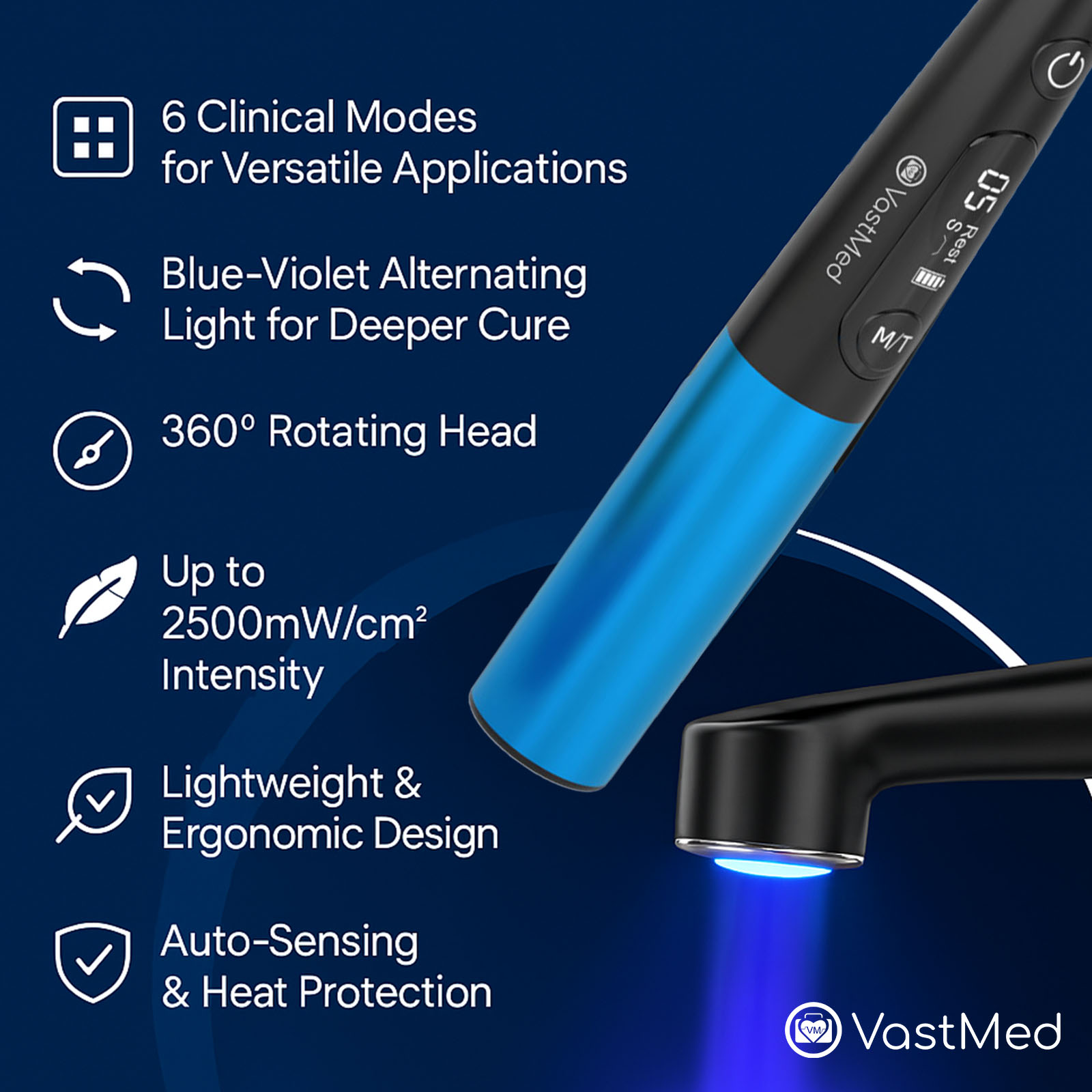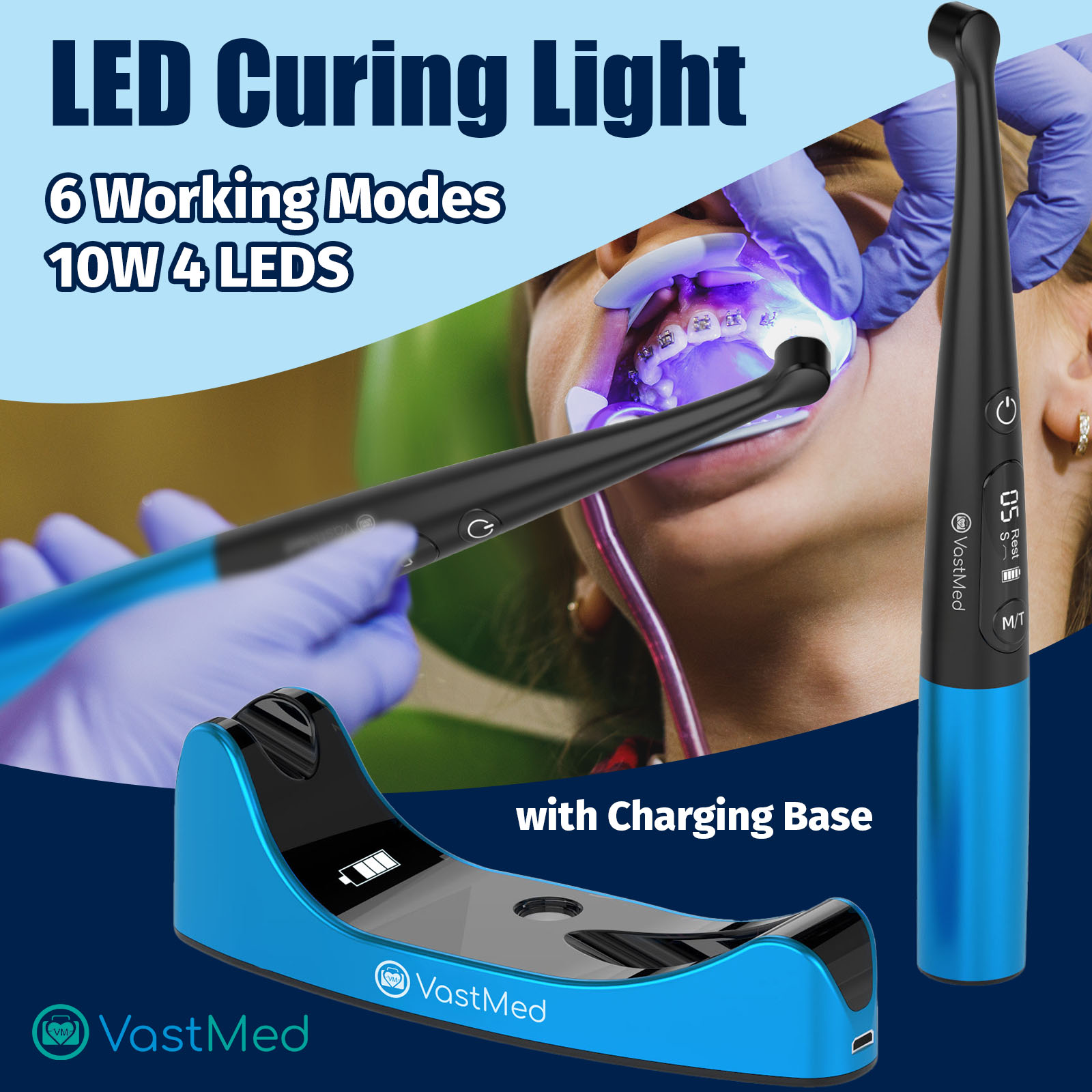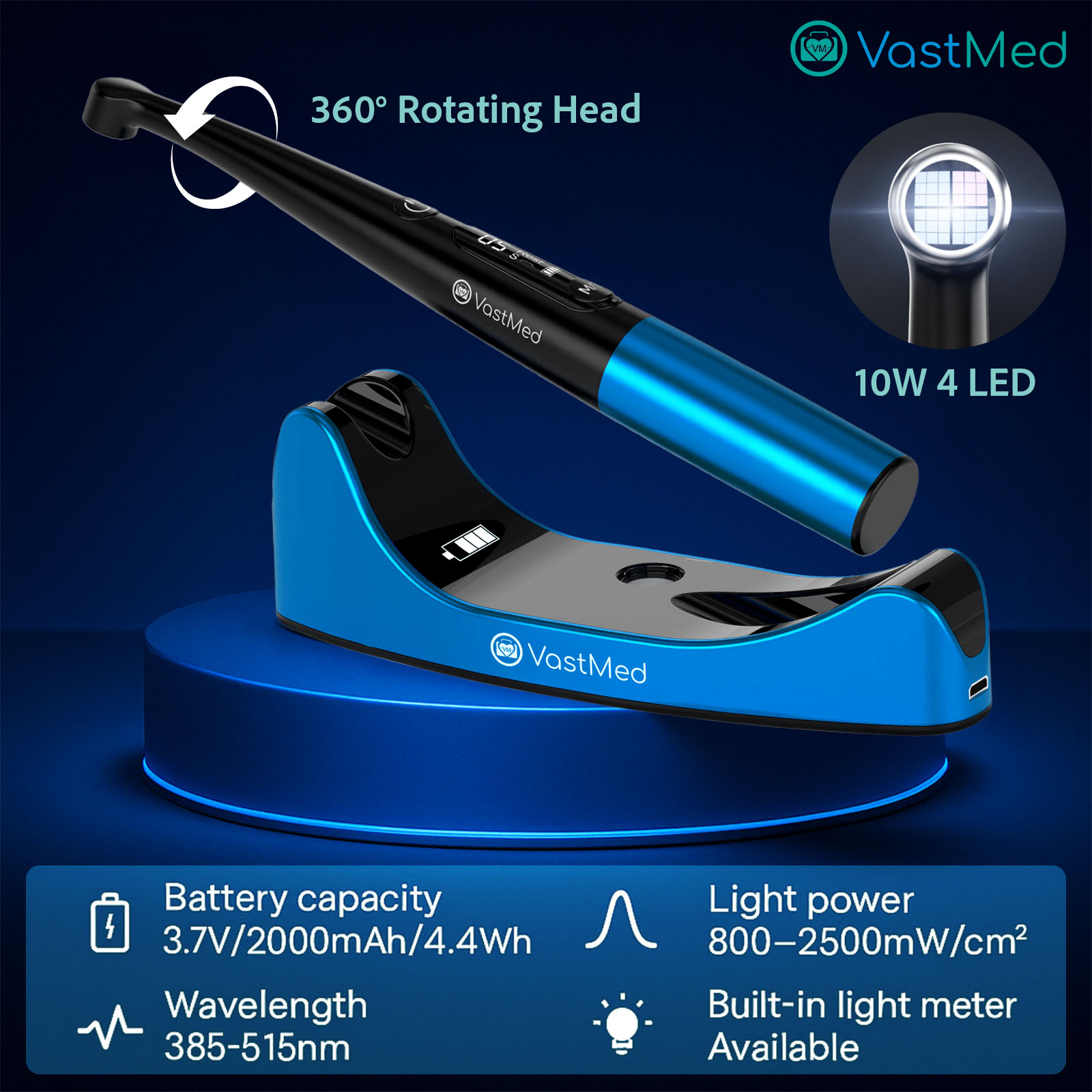 Dental LED Curing Light by VASTMED | 10W Blue-Violet Light with 6 Modes, 2500 mW/cm² Intensity | 360° Rotating Head | Resin Cure Tool with Charging Base – Lightweight & Ergonomic Design