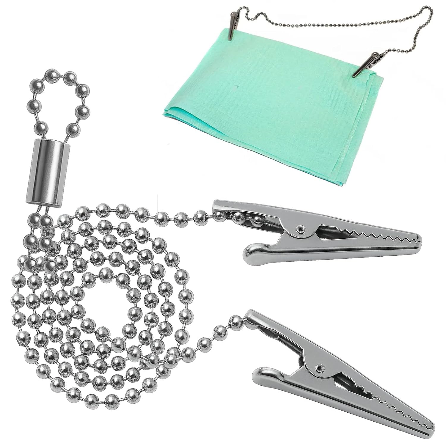 - Convenient to Use – The alligator clips provide a secure hold on dental bibs, napkins, towels, and other items. Simply open the two clips on the clamp napkin holder, secure the bib by clamping its ends, and hang the chain around your neck. This ensures the bib stays firmly in place and effectively prevents items from falling.