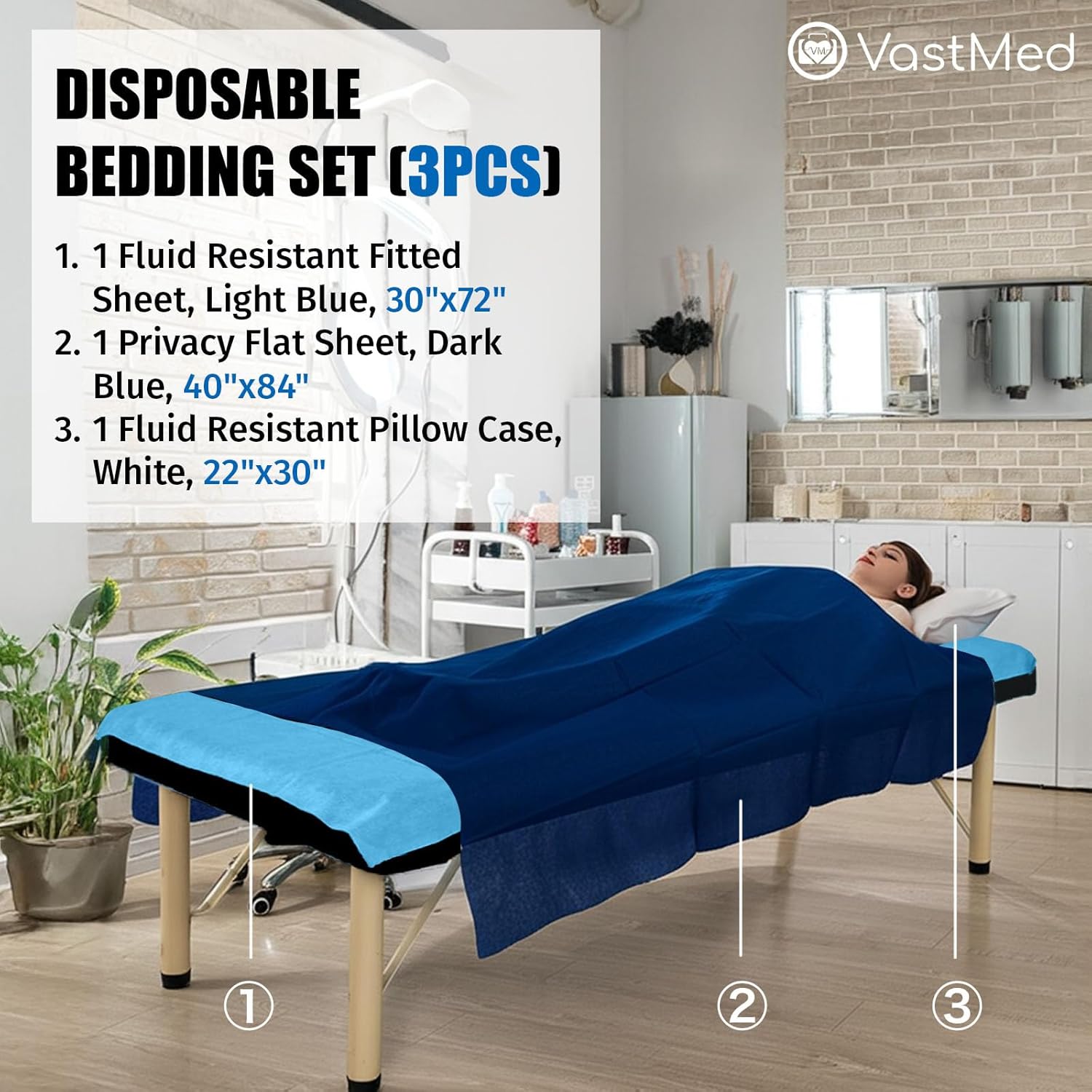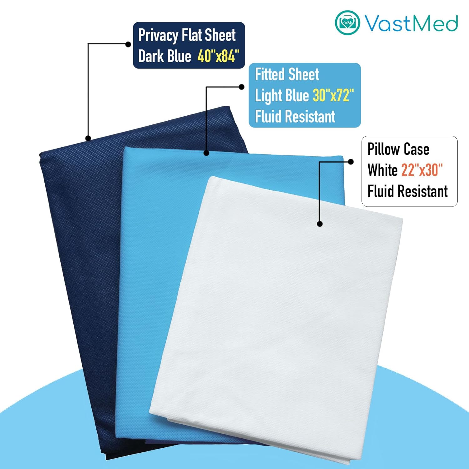Medical Disposable Bedding Set by VASTMED | Fluid-Resistant, Soft Non-Woven Fabric for Hospitals, Clinics, Massage Tables | Fitted Sheet, Flat Sheet & Pillow Case | Blue & White