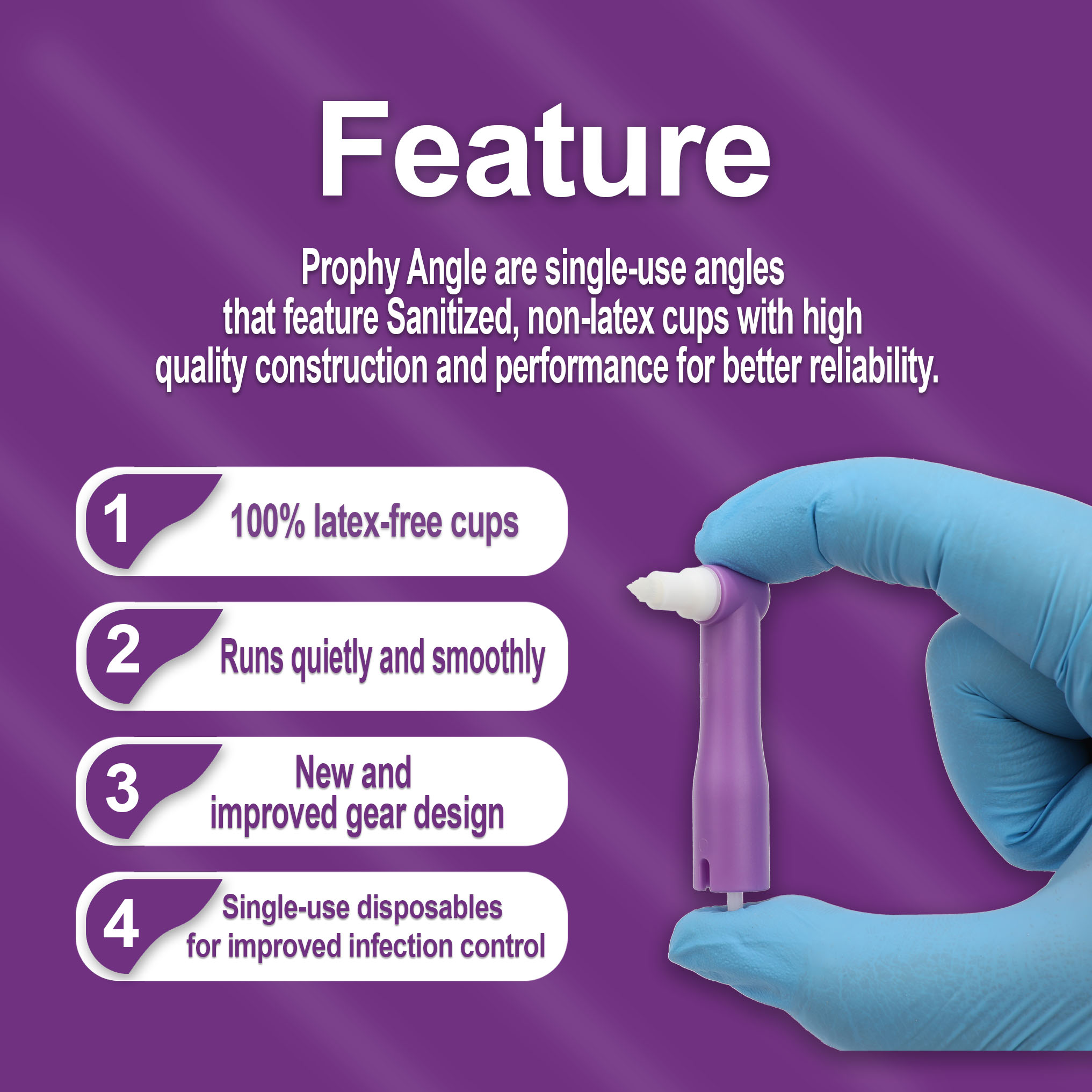 - Letex Free Cups – Our prophy angles with tapered brush, latex-free cups that give your patient a pain-free dental appointment. These prophy angles work well with low-speed dental handpieces, giving you less vibration and reducing cold sensitivity for your patients.