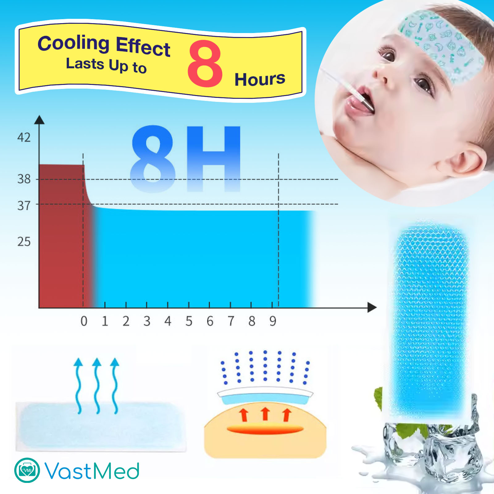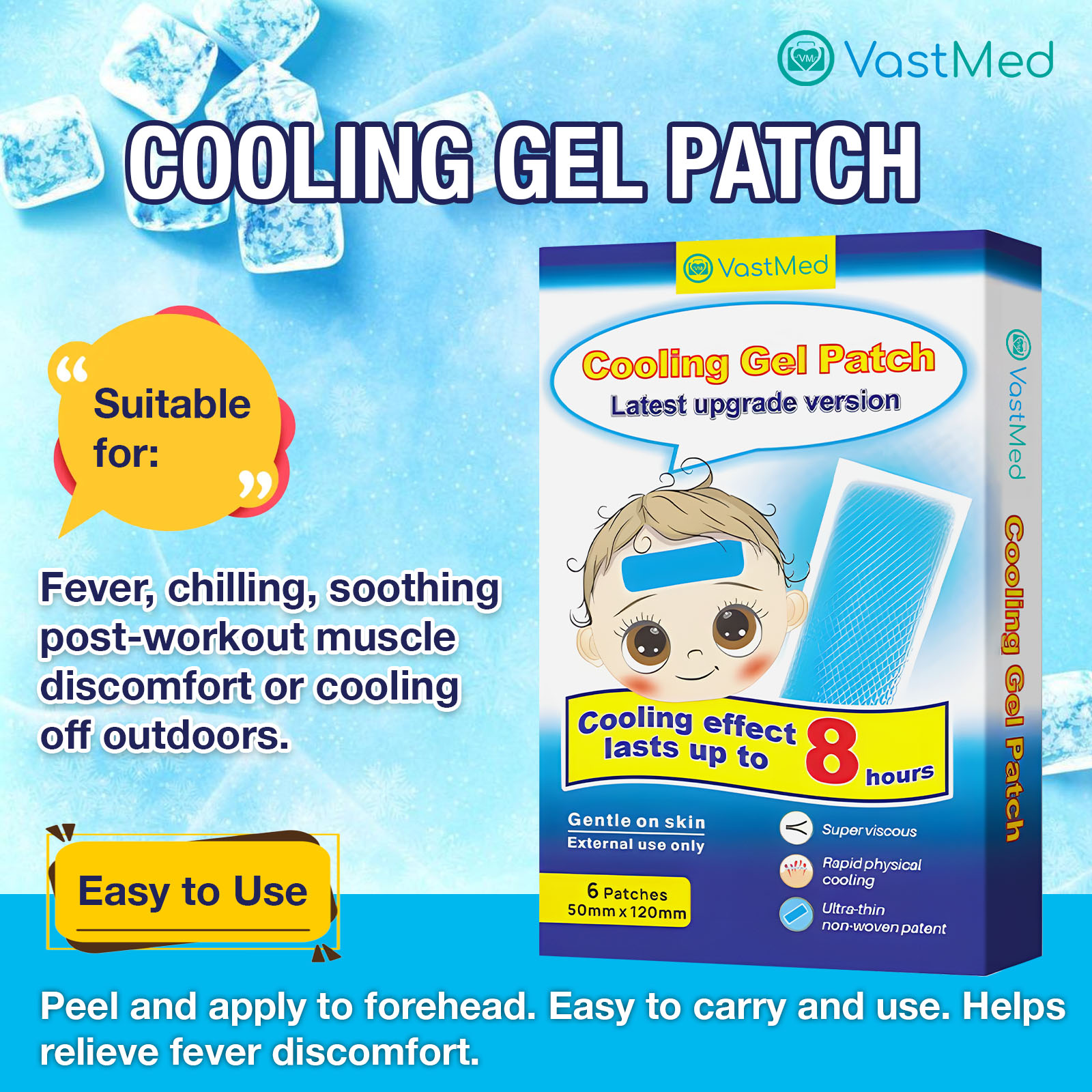 VASTMED 6PCs Cooling Gel Reducing Fever Patch Fever Cooling Patches for Adults, Kids, Babies | Cooling Gel Sheets for Fever, Forehead Relief, 5×12 cm