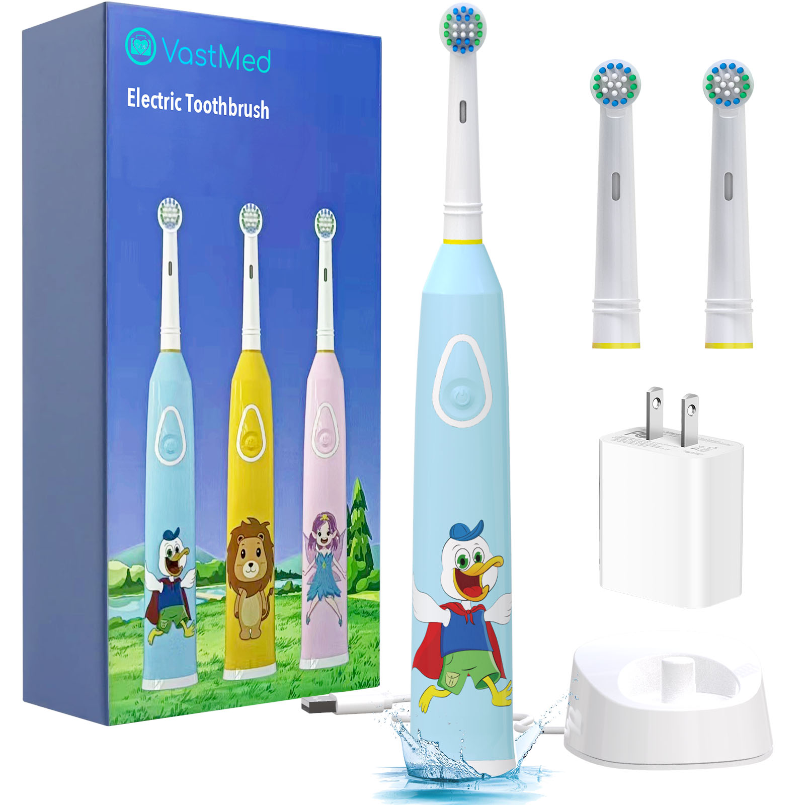 VASTMED Rotating Kids Electric Toothbrush with 2 Brush Heads | IPX7 Cartoon Kids Electric Toothbrushes 3 Modes Rechargeable Toothbrush | 1 USB Charger with Charger Block